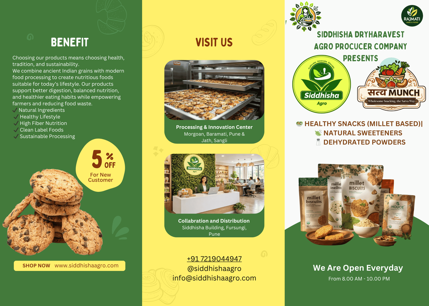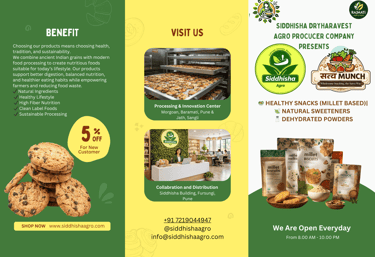 Satva Munch is proudly supported by NutriSakhi and Siddhisha Agro — initiatives dedicated to empowering farmer communities and promoting value-added food production. Through close collaboration with local farmers and self-help groups, we help create income opportunities while ensuring quality sourcing and responsible production practices.